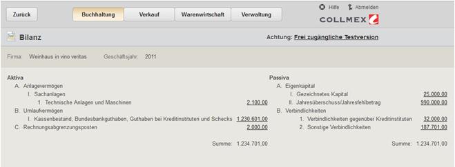 Das folgende Beispiel zeigt die Bilanz aus der Testversion. Bitte starten Sie parallel die