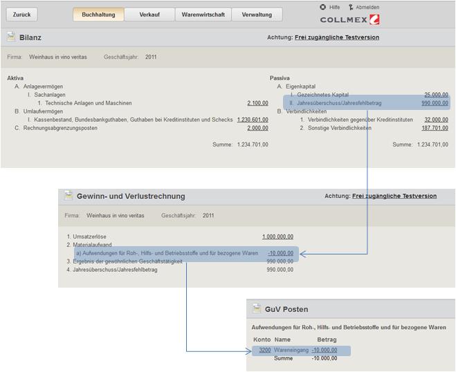 Für den Unternehmer ist die wichtigste Information zweifellos die über Gewinn oder Verlust des Unternehmens. Diese Information verbirgt sich hinter der Position "Jahresüberschuss/Jahresfehlbetrag". Das ist die Gewinn- und Verlustrechung. In ihr werden Aufwendungen und Erträge gegenübergestellt. Klicken Sie in der Testversion nun auf den Betrag!