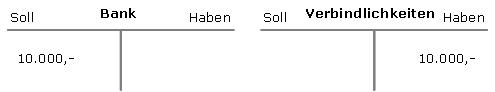 - Das Konto "Bank" steht links in der Bilanz. Es findet eine Mehrung statt => Konto "Bank" wird links mit 10.000,- gebucht.