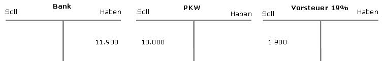 - Das Konto "PKW" zählt zum Anlagevermögen und steht links in der Bilanz. Es findet eine Mehrung statt => das Konto "PKW" wird links gebucht.