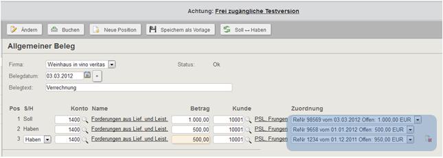 * Nicht in allen Versionen ↑ Inhalt Beleg: ZuordnungHier wird die Buchung angezeigt, die dem Beleg zugeordnet ist. Für noch nicht gebuchte Belege, kann der Beleg einer Buchung nachträglich zugeordnet werden.